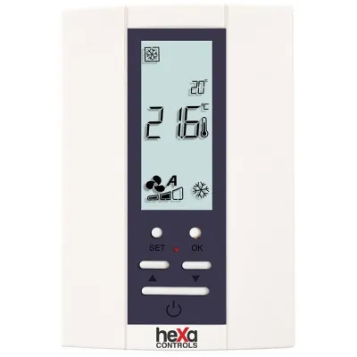3 hız fan kontrol, 2/4 borulu, Isıtma/Soğutma/Havalandırma modu, On/Off vana kontrol, sıva üzeri montaj, pencere/kapı kontak ve harici sensör girişli, haftalık programlanabilir, tuş kilitli, modbus haberleşmeli