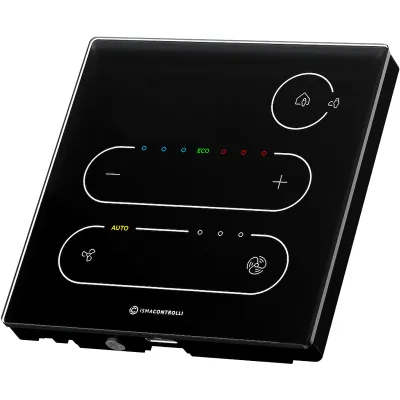 Dijital dokunmatik TFT ekranlı oda kontrol paneli, 0...40°C aralığı sıcaklık ölçümü (±0,5°C hassasiyet), Modbus RTU/ASCII ve BACnet MS/TP seçenekli protokolleri üzerinden haberleşme sağlayabilir, 24V AC/DC enerji beslemeli, IP20 koruma sınıfına haiz, 1,45cm kalınlığında estetik tasarımlı, 2 adet fan için toplam da 5 adet dokunmatik buton kullanımı