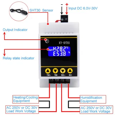 Sıcaklık ve Nem kontrol modülü, 1 metre harici sıcaklık ve nem sensörü dahil, -20...60°C sıcaklık aralığı, 0...100% rh nem ölçüm aralığı, On/Off kontrol, 24V DC, maks. 10A çıkış iki kutup röleli, +/- 0,1C hassasiyet, IP20, dijital ekranlı, pano raya montaj